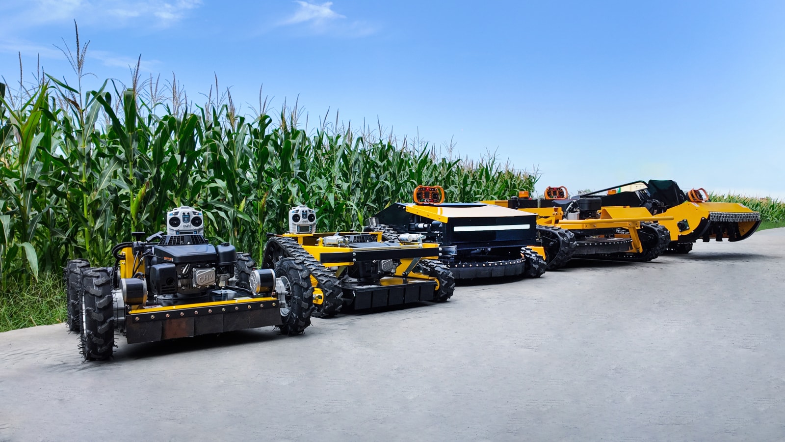 – Large-scale & complex terrains (orchards, slopes): Choose diesel-powered tracked models. Ensure they support a remote control range of over 200 meters and a climbing capacity of ≥45°. The cutter deck is recommended to be made of manganese steel for superior impact resistance.